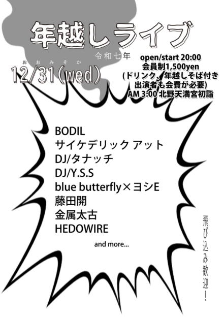 会員制1,500yen(ドリンク、年越しそば付き 出演者も会費が必要)
